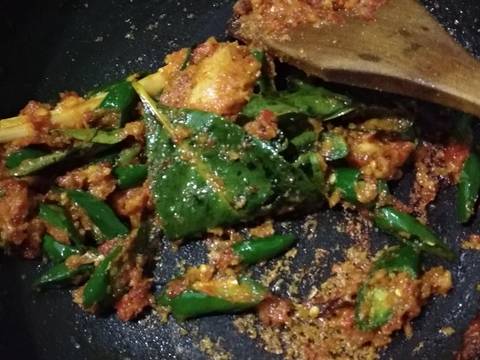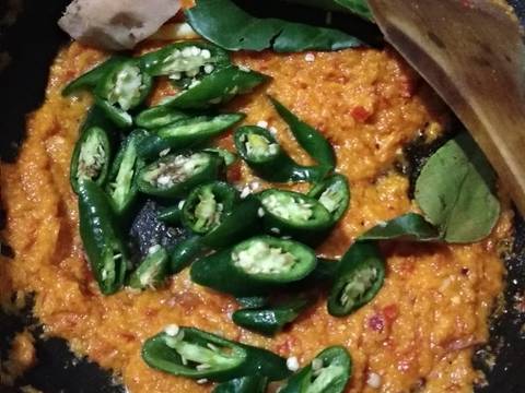 Tumis bumbu halus hingga stgh matang, masukkan irisan Lombok hijau, daun salam, daun jeruk, lengkuas dan serai.
